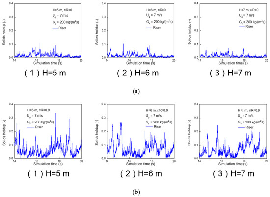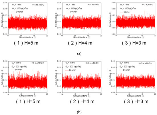 To further analyze the difference of cluster characteristics observed in Figure 4 between the downer and riser, the predicted time evolutions of solids holdup in the center and near the wall at three different radial heights were presented, as shown in Figure 6 and Figure 7. In the riser, most particles were in the form of a dispersed particle phase with a low concentration and smaller fluctuation in the central area. However, the cluster behavior with the peak value of solids holdup can still be captured in the center in this figure. The peak was narrow indicating that the duration of the cluster was short in the center. In the near wall region of the riser, the cluster peak was wider, indicating the duration of the cluster was longer than that in the central region. These results were consistent with the cluster characteristic reported by Zhang et al. [23]. Compared to the riser, the higher fluctuation frequency of solids holdup in both the central and near wall region of the downer indicated a faster rate of cluster formation and dissolution. The higher fluctuation frequency in the downer also indicated that larger clusters were more difficult to be formed in the downer than that in the riser.