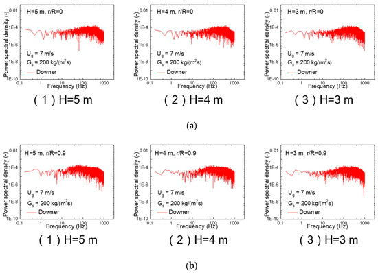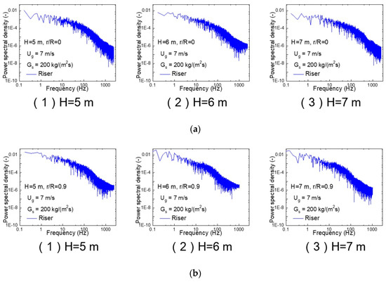 Power spectral density analysis of solids holdup signals in riser under different heights. (a) Center; (b) wall.
