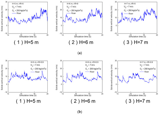 Predicted time evolution of local instantaneous solids vertical velocity at center and near the wall in riser (H = 5, 6, and 7 m). (a) Center; (b) wall.