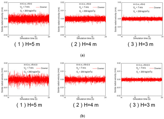 Predicted time evolution of local instantaneous solids radial velocity at center and near the wall in downer (H = 5 m, 4 m, 3 m). (a) Center; (b) wall.
