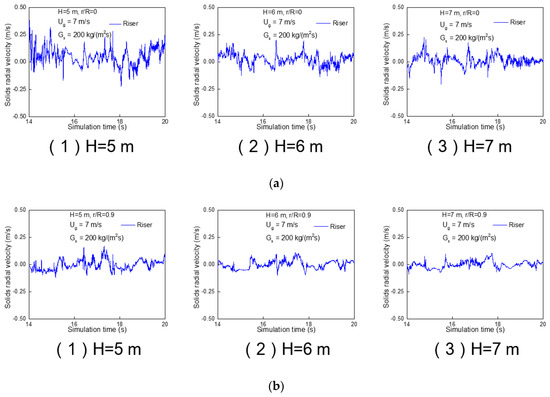 Predicted time evolution of local instantaneous solids radial velocity at center and near the wall in riser (H = 5, 6, and 7 m). (a) Center; (b) wall.