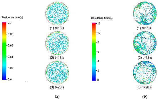 In chemical reaction engineering, the conversion rate and selectivity of desired products in the industrial-scale CFB are closely associated with the solids mixing behavior. The residence time distribution (RTD) of the particles is commonly used to reveal the axial solids mixing behavior inside the riser and downer. Particle tracer technology was usually adopted to study the particle RTD in the CFB system in previous experimental studies [47,48,49,50]. However, the particle tracing process is complicated and it will interfere with the main particle stream inside the bed. Therefore, the reliability of the experimental results may be limited. The CPFD approach is able to obtain the residence time of each individual particle by directly tracking the motion of the particles inside the CFB system. In the CPFD simulation, the overall particle RTD of the whole CFB system can be obtained by statistical analysis of the particles at the outlet, while the local particle RTD can be obtained by statistical analysis of the particles at the cross-section of a specific height.