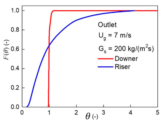 In order to further reveal the difference of solids back-mixing degree between the downer and riser, the predicted cumulative distribution of solids RTD (F(θ) curve) at the outlet of downer and riser are compared in Figure 19. The slope of F(θ) curve is commonly used to reveal the degree of solids back-mixing. Smaller slope represents more intense back-mixing.
