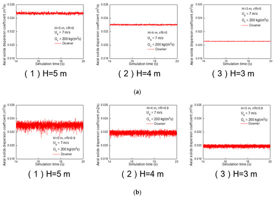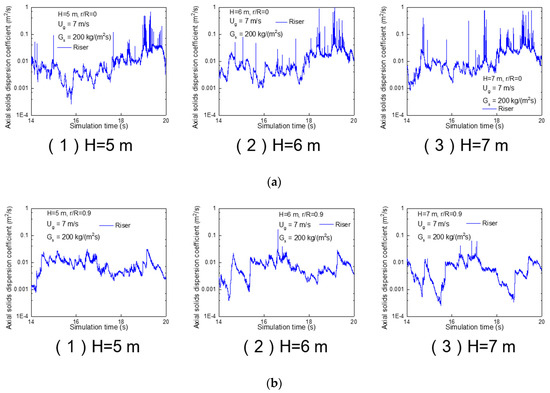 Predicted time evolution of axial solids dispersion coefficient inside riser (H = 5, 6, and 7 m). (a) Center; (b) wall.