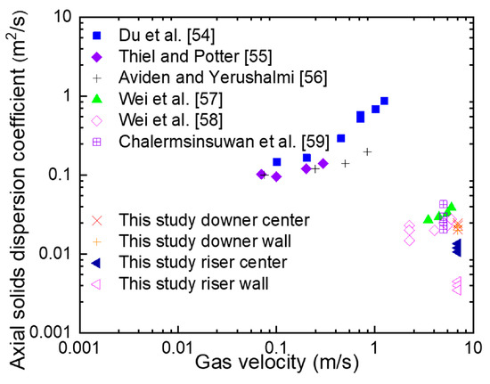 After that, the instantaneous axial solids dispersion coefficients from 14 s to 20 s were statistically averaged to obtain the time-averaged axial solids dispersion coefficients. Then, the time-averaged axial solids dispersion coefficients in the center and near wall region between the downer and riser were compared with those in previously reported experiment [54,55,56,57,58] and simulation results [59], that is shown in Figure 22. The computation results in this study was in the range of the previous experiment and simulation research. The axial solids dispersion coefficient in the downer was higher than that in the riser, which indicated that the solids transportation ability in the downer was higher when the operating conditions were the same. In the riser, the large volume cluster formation near the wall caused a 67% decrease of axial solids dispersion coefficient compared with the central area.