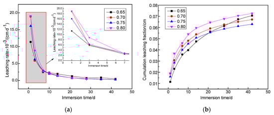 Leaching rate and cumulative fraction leached curves of different water–cement ratios for the MgO–SiO2–H2O solidified bodies with 1.6 wt.% Sr2+ under leaching conditions at an ambient temperature of 25 °C and using deionized water as leachant. (a) Leaching rate curves (b) Cumulative fraction leached curves