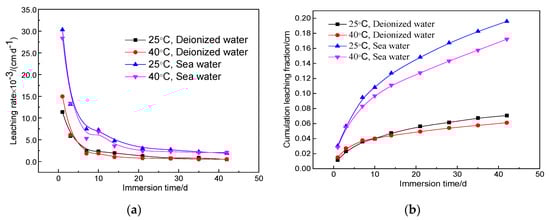 - The leaching rate and cumulative leaching fraction of the solidified body after immersion for 42 days in the standard environment (4.64 × 10−4 cm/d) and high temperature seawater (1.89 × 10−3 cm/d) were one order of magnitude lower than the limit value in the National Standard.