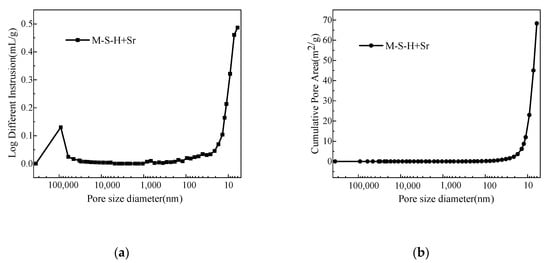 Mercury intrusion porosimetry (MIP) results of the MgO–SiO2–H2O solidified body (water–cement ratio, 0.65; Sr2+ content, 1.6 wt.%); (a) log different intrusion; (b) cumulative pore area.