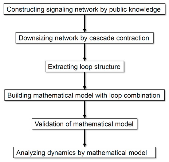 In this study, we developed a new method that consists of comprehensive modeling and the reduction of a comprehensive network to analyze the dynamics of regulatory mechanisms of target phenomena. First, we constructed a comprehensive network from databases and literature information. Second, to reduce the network size, we contracted a cascade structure, consisting of a sequence of unidirectional edges and nodes, and preserved the loop structures which affect the essential behavior of the network [9,10]. This method makes it possible to obtain a small network that can reproduce the dynamic behavior of a large network.
