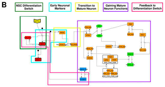 To construct the complete signaling network, relations among molecules involved in neuronal differentiation were collected from the literature and pathway databases [16,17,18,19,20,21,22,23], mainly the NCI Pathway Interaction Database [24] and WikiPathways [25]. The switching mechanisms that determine the direction of differentiation, glia, or neurons, are described in the model. The model does not include pathways activated by glial differentiation, but neuronal differentiation, to focus on the differentiation of NSCs into neurons. The signaling networks were constructed using CellDesigner v4.3 [26] by merging binary relations from each data source and were saved in a Systems Biology Markup Language (SBML) format. The complete signaling network was constructed by manually merging all the SBML files. Then, every molecule was color-coded according to its type (receptor, enzyme, transcription factor, or other). Finally, the enzymes and other molecules were divided into active and inactive forms. The graphical representation conformed to the proposed set of symbols in CellDesigner [27].