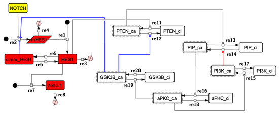 Because the core network was still too complex to convert into a mathematical model, we contracted it to the minimum nodes, but maintained the feedback loop structures, including the differentiation switch NOTCH and the indicators of characteristic dynamics before and after differentiation (Figure 4). The self-negative-feedback loop formed by HES1 dimerization—HES1 -> dimer_HES1 -| HES1—was reconstructed as a three-molecule loop by adding mRNA of HES1 (mHES1) as a transcriptional process, because the self-negative feedback loop represented by transcriptional and translational processes was actually composed of the generation of mRNA and translation of mRNA (see Methods for details). Although previous studies introduced a delay into the model [12,13], we convolved the delay with the parameters of the HES1 translation and dimerization steps. The non-delay model of the HES1 self-loop generated oscillations (Figure A2 and Figure A3, and Table A2). To minimize the network, most feedback loops were converted to three-molecule loops by cascade contraction. The contracted cascades were represented with the nodes in our digested model. The names of the nodes were determined based on the name of the first or last node of the original cascade, with the addition of the suffix _ca or _ci. The suffix _ca denoted the active form of a cascade, and _ci denoted the inactive form. The positive-feedback loop between PI3K and aPKC_PAR3_PAR6— PI3K -> PIP3 -> RAP1B -> CDC42_GEF -> CDC42 -> aPKC_PAR3_PAR6 -> TIAM1/2 -> RAC1 -> PI3K—was reconstructed as a three-molecule loop, and the contracted nodes were named PIP_ca (PIP_ci), aPKC_ca (aPKC_ci), and PI3K_ca (PI3K_ci) (Figure A4). The negative-feedback loop between PTEN and GSK3B—PTEN -| PIP3 -> RAP1B -> CDC42_GEF -> CDC42 -> aPKC_PAR3_PAR6 -| GSK3B -| PTEN—was reconstructed as a four-molecule loop, and the contracted nodes were named PTEN_ca (PTEN_ci) and GSK3B_ca (GSK3B_ci) (Figure A5). The negative-feedback loop between beta-catenin and HES1—HES1 -| NEUROG2 -| RHOA -> Rho_kinase -> PTEN -| PIP3 -> RAP1B -> CDC42_GEF -> CDC42 -> aPKC_PAR3_PAR6 -| GSK3B -| B-catenin -> HES1—was reconstructed as a six-molecule loop (Figure A6). This network was translated into a deterministic mathematical digested model governed by the Hill equation and Michaelis–Menten kinetics (Table 1). The final digested model was constructed using nine molecules (15 nodes) and 20 reactions, which reduced the network size by 84.3% in comparison with the entire signaling network. Thereafter, the dynamics of neuronal differentiation were analyzed by using the digested model. The model is provided as an SBML file in the Supplementary Materials.