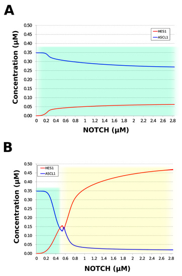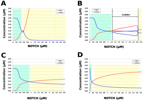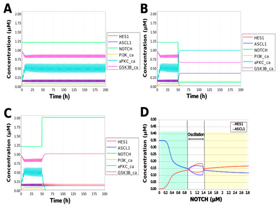We analyzed the contribution of each loop to the results of simulation of NOTCH responsiveness by bifurcation analysis. To simulate a loss-of-function mutation that inhibits the self-feedback regulation of HES1, we collapsed the self-feedback loop of HES1 in our model and executed the simulation (Figure A8). When the loop was collapsed by changing equation 2 to equation 2’ (Table 4), the oscillatory state, which is important for maintaining the undifferentiated state, disappeared. At the same time, the ASCL1-dominant state, which is important for differentiation into neurons, became narrower with rapid HES1 upregulation (Figure 7A). Therefore, this loop is required to maintain the oscillatory state and ASCL1-dominant state. This result agreed with the reported result of HES1 inhibition by the overexpression of Id2 [15]. To simulate the specific inhibition of the effect of GSK3B on PTEN, we collapsed the negative feedback loop between GSK3B and PTEN by changing equations 5 and 6 to equations 5’ and 6’, respectively (Table 4, Figure A9). The oscillatory state shifted to higher NOTCH concentrations (Figure 7B), which means that this loop was involved in the sensitivity of oscillations to the NOTCH concentration. GSK3B may promote or inhibit NOTCH signaling under different conditions, depending on the loops involved [40,41,42,43]. The dichotomic characteristics of GSK3B may enable it to arbitrate the response to NOTCH, given that our simulation suggested that the GSK3B−PTEN loop regulated the sensitivity of oscillations to NOTCH. To simulate the specific inhibition of the effect of PI3K to PIP2, we collapsed the positive feedback loop between aPKC_PAR3_PAR6 and PI3K by changing equations 7 and 8 to equations 7’ and 8’, respectively (Table 4, Figure A10). The relative changes in HES1 and ASCL1 concentrations with the NOTCH concentration were maintained, but the oscillatory state disappeared (Figure 7C). Therefore, the aPKC_PAR3_PAR6−PI3K loop is required to maintain the oscillatory state. We estimated the effect of the collapse of this loop by inhibiting PI3K. A PI3K inhibitor, LY294002, inhibits the proliferation of neural progenitor cells [23,43]; our result agreed with the published data. To simulate the specific inhibition of the effect of beta-catenin on HES1, we collapsed the negative feedback loop between beta-catenin and HES1 by changing equation 2 to equation 2’’ (Table 4, Figure A11). The oscillations disappeared and the ASCL1-dominant state became narrower (Figure 7D), indicating that this loop is required for maintaining oscillations and upregulating ASCL1 at low concentrations of NOTCH. The collapse of this loop equals beta-catenin inhibition, which represses the proliferation of neural progenitor cells and accelerates glial differentiation [44,45]. Glial differentiation is induced without oscillation under ASCL1 repression [14]. Our result that the collapse of this loop leads to ASCL1 repression is consistent with the reported acceleration of glial differentiation by beta-catenin inhibition. These results suggest that multiple feedback loops are essential for the characteristic dynamics of neural differentiation.