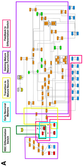 To construct the complete signaling network, relations among molecules involved in neuronal differentiation were collected from the literature and pathway databases [16,17,18,19,20,21,22,23], mainly the NCI Pathway Interaction Database [24] and WikiPathways [25]. The switching mechanisms that determine the direction of differentiation, glia, or neurons, are described in the model. The model does not include pathways activated by glial differentiation, but neuronal differentiation, to focus on the differentiation of NSCs into neurons. The signaling networks were constructed using CellDesigner v4.3 [26] by merging binary relations from each data source and were saved in a Systems Biology Markup Language (SBML) format. The complete signaling network was constructed by manually merging all the SBML files. Then, every molecule was color-coded according to its type (receptor, enzyme, transcription factor, or other). Finally, the enzymes and other molecules were divided into active and inactive forms. The graphical representation conformed to the proposed set of symbols in CellDesigner [27].