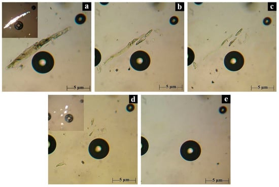 In the upper left corner inset of the photographs obtained in crossed polaroids are shown in Figure 3a,d, dark circles in the photographs are air bubbles. A series of micrographs (Figure 3a–e) was obtained with a time interval of 1 min.