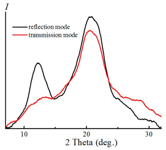 The nascent films were dehydrated under room conditions (T = 22 °C, air humidity ~50%) until the moisture content became equal to ~5%. The evolution of the BC films structure in the process of water removal leads to increase in the intensity of the main cellulose reflexes. The change in the intensity of the basal reflexes during dehydration is due to the change in the preferred orientation of BC crystallites and strips. The absence of a broad background of the water in the 2θ region 20–35° allows for the suggestion that the films lost most of the water during the first hour of dehydration. The angular positions of the basal reflexes (~14.6°, ~16.6° and ~22.7°) correspond to the cellulose polymorphic form I []. It is important to note that the intensity of the peaks depends on the diffraction analysis mode. Comparison of the diffraction patterns obtained in reflection and transmission modes revealed a difference in their shape.
