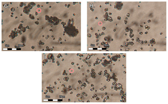 The graphic images of microencapsulated curcumin (MECs) (5 % of wall material contained in S7–S9, i.e., (G–I) on a 5 ppm curcumin content bases) observed under transmission electron microscope (100× magnification) corresponding to the sample number listed in Table 1 (Experimental samples 1 → 9 referred to (A → I)).