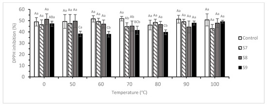 Figure 2 shows the changes in DPPH free radical scavenging activity of the control and S7–S9 at 50 ppm after heating for 10 min under different water bath temperatures. Based on the results shown in Figure 2, there were no significant differences in DPPH free radical scavenging activity in the samples from 0 to 100 °C (p ≥ 0.05); although DPPH free radical scavenging activity began to decrease at 50 °C (from 47.25% ± 2.30% to 38.18% ± 2.43%) in S9, it increased again from 38.18% ± 2.43% to 49.09% ± 1.19% after temperature increased to >100 °C. Because the results of control and the literature [25] showed that there was no significant difference in DPPH when the control was heated for 10 min at 50–100 °C (p ≥ 0.05) and curcumin absorbance was only decreased by 6.2% after heating at 100 °C for 10 min compared with the 0 °C experiment, the possibility that S9 exhibits lower DPPH free radical scavenging activity at 50–80 °C due to curcumin degradation can be excluded. Therefore, it can be inferred that S9 has a better encapsulation rate and that heating causes the mesh structure formed between β-cyclodextrin and porous starch to form tighter links with curcumin. This causes incomplete dissolution when methanol was used for reconstitution as well as a decrease in DPPH free radical scavenging activity. High temperature (100 °C) disrupts this mesh structure, releasing curcumin, which increases the DPPH free radical scavenging activity.