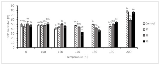 Because no significant difference was noted in DPPH free-radical scavenging activity at 50–100 °C water bath heating between the S7–S9 and the control (p ≥ 0.05), this experiment aimed to use higher temperatures (150–200 °C) and prolonged heating duration (30 min) for investigating the effects on DPPH free radical scavenging activity in the different samples.