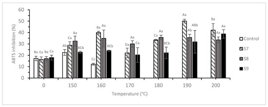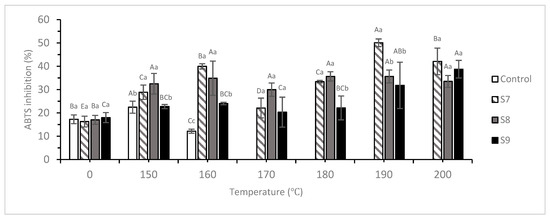 Although S7 showed a decrease in scavenging activity at 160 °C (44.13% ± 1.14%), it increased after further increase in temperature, with the other MEC samples also showing similar trends: S8 showed a decrease at 170 °C and 180 °C, with scavenging activities of 44.34% ± 1.43% and 41.78% ± 1.09%, respectively, and S9 showed decreasing trends at the same temperatures, with scavenging activities of 32.94% ± 6.48% and 36.42% ± 2.18%, respectively. However, S8 and S9 were similar to S7 and their scavenging activities increased after further increase in temperature. At the highest temperature (200 °C), the scavenging activities of the three samples were the highest (77.04% ± 2.48%, 58.40% ± 3.62%, and 75.76% ± 2.19%, respectively, for S7, S8, and S9).