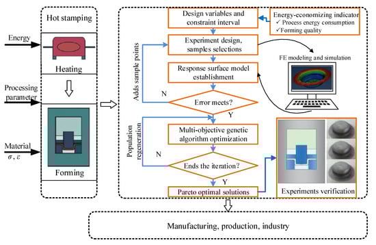 A descriptive flowchart depicting the major steps of the proposed methodology is shown in Figure 1, which provides an outline for this study. A hot stamping process contains heating and forming processes; energy and material are supplied for the process with different processing parameters. In order to achieve an environmentally-friendly manufacturing process, energy reduction is essential. Process energy consumption and forming quality are considered in the process optimization method of hot stamping, which are taken as the energy-economizing indices. These indices of hot stamping are regarded as the optimization objectives. The forming quality and energy consumption under different process parameters are qualified by the developed models or simulation and experiments. The range and constraints of the optimized process parameters should be initially determined in accordance with the forming performance and requirements. Then, sample points should be selected in the design space for experiments, and the corresponding simulations or experiments be conducted to obtain the corresponding evaluation index values of each sample point. Our model was developed to study the relationship between the process parameters and each index, which was solved using a multiobjective genetic algorithm (NSGA-II) and offers feasible optimized solutions. The comparison between the numerically-predicted technical parameters of the stamps and the real experimental results demonstrate the applicability of the method. The multiobjective optimization method can improve the energy efficiency of hot stamping while maintaining the required quality of the stamps. The proposed energy-economizing can provide a reference for industrial manufacturing and production, especially for vehicle production.