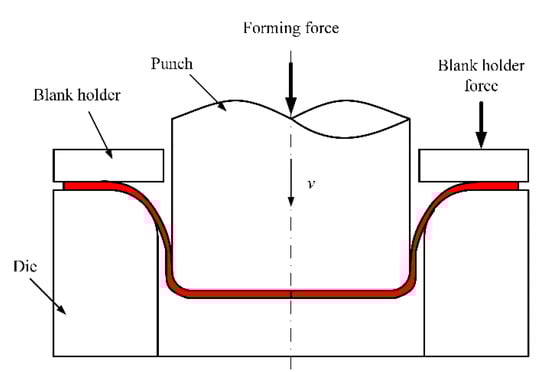The forming stage in hot stamping is similar to that in cold stamping, as shown in Figure 2. The heated sheet material is placed on a die with a blank holder to avoid wrinkle defects. The forming press controls the punch to draw the blank into the die and to form it into the desired shape with the elastic–plastic deformation of the sheet metal and the contact friction between the sheet material and dies []. Therefore, the energy consumption of the forming stage in the hot stamping process can be quantified from two perspectives. The direct ways are measuring and estimating the energy consumption of the forming equipment [], which can be described as
