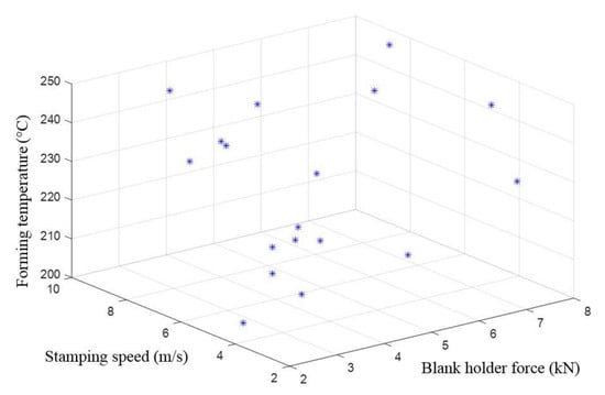 On the basis of the aforementioned experimental design method, the LHD sampling method is used to sample the point in the range of each process parameter, and the least number of sample points required by the response surface model is determined through the least squares method. The number of samples n can be determined in terms of the equation n = (m + 1)(m + 2)/2 of the number of considered process parameters m. Given that the number of process parameters m is 3, the number of samples n is at least 10. Eighteen design sample points are selected to improve the accuracy of the response surface model, and Figure 5 illustrates their value distribution.