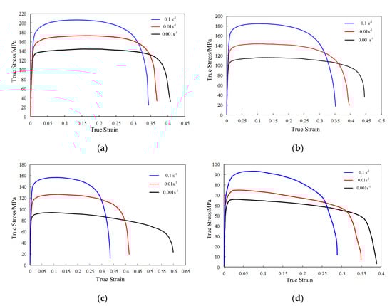 True stress-strain curves for ZK60 magnesium alloy deformed at different temperatures and strain rates: (a) 175 °C; (b) 200 °C; (c) 225 °C; (d) 250 °C.