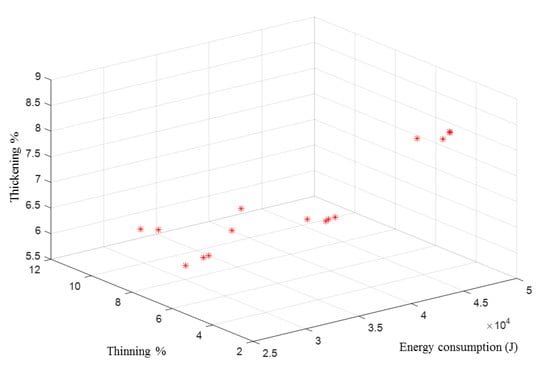 In accordance with the friction condition between the blank and tools in the actual stamping process, the friction coefficient is set as 0.12 in the simulation. The blank is heated via in-mold heating. This heating method is advantageous in that the variation of temperature is relatively small; therefore, the temperature distribution of the sheet is uniform and has good formability. However, the energy consumption used for heating will be considerably higher than that for furnace heating. The simulations are performed on the basis of the design points in Figure 5, and the corresponding energy consumption is calculated through a previous energy consumption theoretical model. Table 3 shows the results.