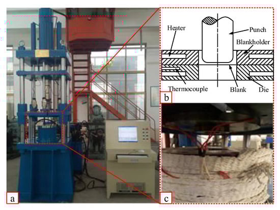 The temperature in the die was raised to 225 °C by internal heating, as shown in Figure 12b,c. Then, the prepared ZK60 magnesium alloy sheet material is placed into the die, and the mold is closed. The heat preservation time is set as 10 min to heat the blank fully. The process parameters of the forming press are set as follows: 8 kN blank holder force and 3 mm/s stamping speed (Table 4). The stamping experiment is then conducted. Three groups of experiments are conducted in accordance with the above experimental steps. Then, to reduce the temperature of the die to 200 °C and repeat above experimental steps, the process parameters are set as follows: 4.7 kN blank holder force and 3.3 mm/s stamping speed (Table 4).