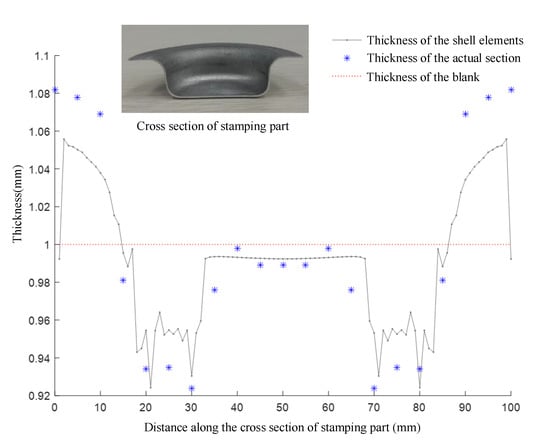 The thickness variation of a stamping part is an important index of the forming quality. Therefore, the thickness variation of the stamping parts obtained by the hot drawing experiment under the process parameters of comprise solution 2 is compared with that of the simulation results, as shown in Figure 14. The thickness variation distribution of each shell element in the FE model can be read in the postprocessing of the simulation. The thickness variation distribution of the stamping parts is measured along the symmetrical section of the parts by a micrometer. The results show that the thickness variation distribution obtained by the FE method is consistent with that obtained by the experiment, which further verifies the validity and rationality of the FE process simulation of hot stamping.