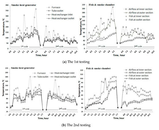 Three batches of skipjack were smoked using this smokehouse design and temperatures captured of the smoke–heat generators and the fish within the smoking chamber. In one batch of the smoking process, the fish was smoked in two cycles whose total time varied between 11.6 to 14.7 h. The charts of temperatures for the three tests, as seen in Figure 4, have the same trend both on the smoke–heat generator and the fish in the smoking chamber. The trend of temperatures for the first cycle of fish smoking, for example, increased slowly to the highest temperature at 68–80 °C, correlating with the temperature increment of the smoke–heat generated in the furnace. The temperature increment of the combustion chamber within the furnace for all three tests has contributed directly to the fish core temperatures achieved in the smoking chamber. This crucial stage was the cooking process of the skipjack, which is in line with the aim of the hot-smoking method.