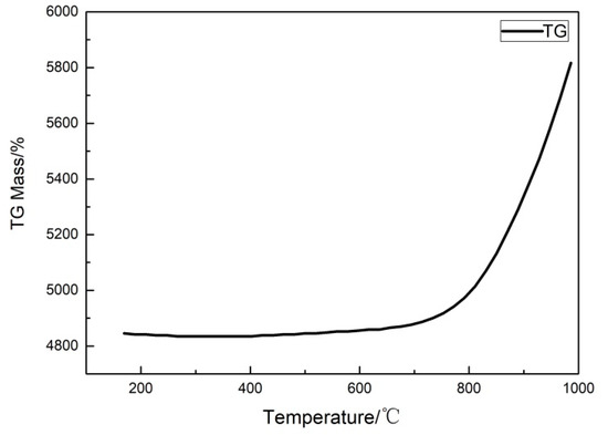 In order to determine the in situ oxidation temperature, the oxidation resistance of porous Ti support was investigated by the thermogravimetric method, which is shown in Figure 2. It was found that the mass of the support had a smaller change under an oxidation temperature below 700 °C, which indicated that the porous Ti metal support had a good oxidation resistance. When the oxidation temperature was higher than 800 °C, the sample began to oxidize at this temperature. While the oxidation temperature exceeded 850 °C, the mass of the sample increased sharply. Therefore, the in situ oxidation temperature of porous Ti support can then be determined between 700 °C and 850 °C, and the optimum oxidation temperature can be determined by studying the properties of the membranes prepared at different temperatures.