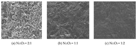 The gas flux of TiO2/Ti composite membrane after in situ oxidation at 800 °C for 60 min was measured using a gas permeation device; the test results are shown in Figure 6. The N2 permeability of the composite membrane decreased gradually with the increase of oxygen concentration. This was because when the oxygen concentration was N2:O2 = 2:1, the oxide layer formed on the surface of the support was thin and there were small pores generated on the surface, which had little effect on the permeability of N2. With an increase in oxygen concentration, a dense oxide layer was formed on the surface and the thickness increased gradually, which seriously affected the gas permeability of the support. This was consistent with the results of SEM image analysis of the support.