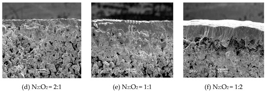 Figure 4 shows the surface and cross-section micromorphology of the TiO2/Ti composite membranes at different oxygen concentrations. As can be seen from the surface SEM figure, with the increase of oxygen concentration, the surface oxide layer gradually increased. When N2:O2 = 2:1, the surface of the Ti support changed significantly, and a continuous membrane layer was formed on the surface. When N2:O2 = 1:1, the surface of the Ti support was smoother and part of the surface became dense. When the N2:O2 = 1:2, the dense portion of the surface oxide layer continued to increase, which was an indication that the samples would probably present lower or no gas permeability. It can be seen from the cross-section SEM image, with an increase in oxygen concentration, the thickness of the oxide membrane gradually increased. When N2:O2 = 2:1, a continuous ceramic membrane layer was formed on the surface of the support, and the thickness was relatively uniform. The skeleton structure of the support section was still clearly visible, which could be attributed to the in situ oxidation that firstly occurred on the surface of the metal support or adjacent to the surface, the narrow pores further prevented the diffusion of oxygen molecules, so the support after the in situ oxidation still had a large gas permeability, good mechanical strength, and stability. When N2:O2 = 1:1, a thick membrane layer was formed on the surface of the support, and partial oxidation occurred inside the support near the membrane surface, which affected the performance of the composite membrane. When N2:O2 = 1:2, the thickness of the membrane continued to increase, and a large number of voids appeared between the oxide layer and the support, this was due to the increase in the oxidation rate when the oxygen concentration was high, which seriously affected the stability of the composite membrane.