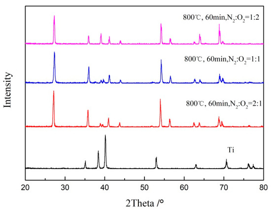 XRD pattern of Ti support after oxidation at different temperatures (800 °C, N2:O2 = 2:1).