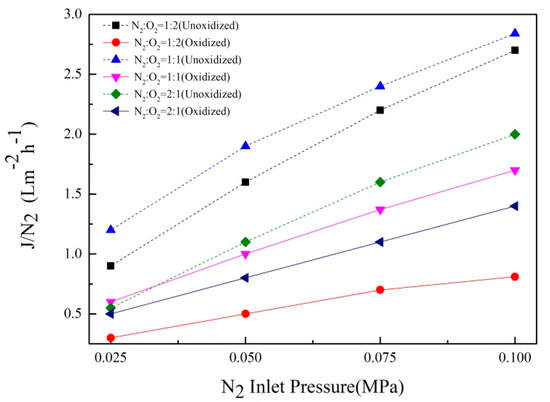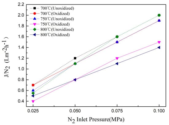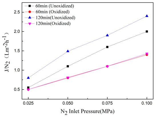 Figure 9 showed the gas flux change curve of the composite membrane prepared under N2:O2 = 2:1 for 60 min, at different temperatures. From Figure 9 it can be seen that the gas flux increased with an increase in the inlet pressure. It can also be observed that the gas flux began to decline with an increase in the oxidation temperature, and the change of gas flux increased with an increase in temperature. This was because the oxide layer was formed on the surface of the support, at 700 °C and 750 °C, but it did not change the surface morphology of the support, and had a little effect on the pore size. However, with an increase in the oxidation temperature, a continuous and complete oxidation film layer was formed on the surface of the support, at 800 °C. The gas permeability of the composite membrane decreased gradually due to the decrease in the pore size of the membrane, which was consistent with the results of the SEM and XRD analysis.