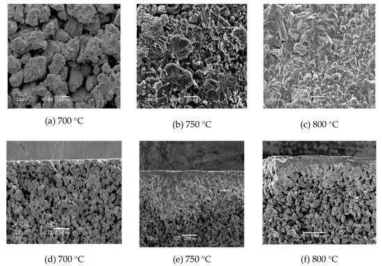 Figure 7 shows the surface and cross-section SEM morphology of the composite membrane after in situ oxidation, under oxygen concentration N2:O2 = 2:1 for 60 min, at different temperatures. According to the surface SEM images, the surface morphology of the support after in situ oxidation treatment at 700 °C for 60 min was basically unchanged, compared to the original sample, indicating that the complete membrane layer was not formed, which was consistent with the results of thermogravimetric analysis. When the temperature rose to 750 °C, the surface oxide layer gradually increased, and the Ti particles began to bond together, and a layer was formed on the surface of the support. The SEM images at 800 °C showed that a continuous and smooth oxidized ceramic membrane was formed, and the pore size was modified at the same time. From the SEM image of the cross-section, it can be seen that the thickness of the oxide layer gradually increased as the in situ oxidation temperature increased. The skeleton structure of the support was visible clearly at 700 °C, and a thin layer of oxide layer appeared on the surface, which proved that no complete oxidation membrane was formed. A complete ceramic membrane was formed on the surface of the support at 750 °C and 800 °C, and it could be clearly seen that there was no change in the internal pores of the support, but the samples were only slightly oxidized in some areas near the oxide layer, indicating the oxide layer effectively prevented oxygen molecules entering into the pore of the support, so that the in situ oxidation mainly occurred on the surface of the support.