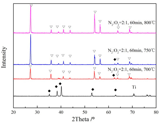 The TiO2/Ti composite membranes were analyzed through X-ray diffraction (XRD) under N2:O2 = 2:1 for 60 min, at different temperatures. As shown in Figure 8, compared to the XRD analysis results of porous Ti metal support, when the temperature was 700 °C and 750 °C, both the characteristic peak of the rutile (PDF: 21-1267) and the metal Ti appeared on the surface of the support, which indicated that the support was oxidized at these two temperatures to form a layer of oxide; nevertheless, this layer of oxide was thin. When the samples were oxidized at 800 °C for 60 min, the characteristic peak of the metal Ti completely disappeared, and only the characteristic peak of the rutile was analyzed. This was due to the formation of a thick oxidation membrane on the surface after in situ oxidation at 800 °C, which indicated that a continuous and complete oxide layer was formed on the surface of the porous Ti support, at this temperature.