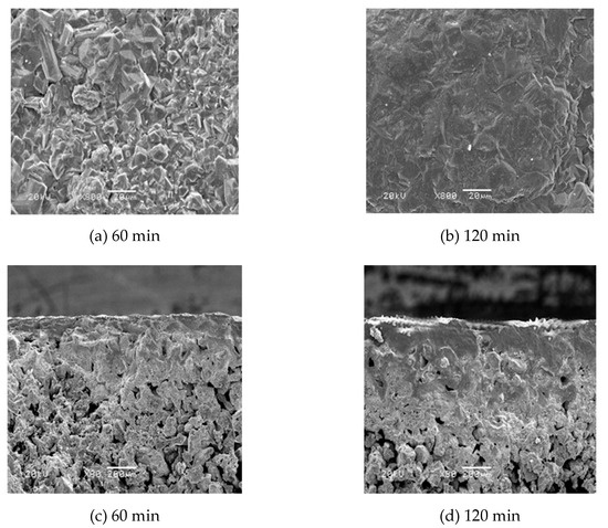 The surface and cross-section morphology of the porous Ti support are shown in Figure 10 after oxidation at 800 °C and N2:O2 = 2:1 for different times. It can be seen from the surface SEM image that the surface of the Ti particles of the support changed significantly after 60 min of oxidation, when a continuous and flat oxide layer formed on the surface of the support. The surface morphology after oxidation for 120 min demonstrated that the oxide layer on the surface of the support was uniform and flat, but the surface portion was completely dense, resulting in a decrease or loss of the gas permeation rate of the support. From the cross-sectional SEM image, it can be observed that the thickness of the oxide layer gradually increased as the oxidation time increased. After 60 min of oxidation, a complete oxide film layer was formed on the surface, and oxidation was observed in the area near the surface of the support. The thickness of the formed oxide layer was thinner, and the internal pore structure of the support was less affected. The surface of the support oxidized for 120 min, formed a thick oxide film layer, and the inner pores of the support were also severely oxidized, which affected the gas flux and stability of the composite membrane.