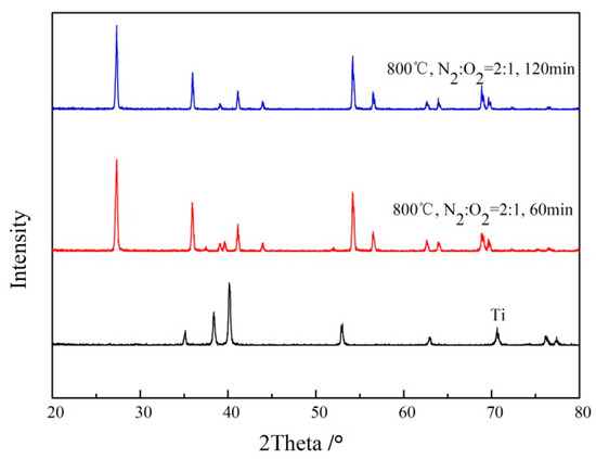 The TiO2/Ti composite membranes after oxidation at 800 ℃ and different oxygen concentrations for 60 min were analyzed by X-ray diffraction (XRD); results are shown in Figure 5. It was found that the TiO2 peak of rutile (PDF: 21-1267) appeared on the surface of the support, and no characteristic peak of metal Ti was found, which was mainly due to the formation of more oxides on the surface of the support, at 800 °C. The results showed that a complete TiO2 oxide layer had formed on the surface of porous Ti support, under this condition.