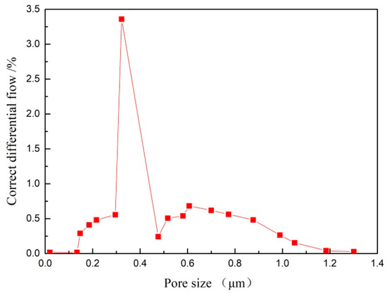 The TiO2/Ti composite membrane was prepared under the conditions of N2:O2 = 2:1, 800 °C for 60 min. The pore size distribution of the composite membrane was tested through the bubble pressure method. Figure 13 shows the pore size distribution of the TiO2/Ti composite membrane. As can be seen from the figure, the TiO2/Ti composite membrane had a narrow pore size distribution, and the mean pore-size was about 0.312 μm.