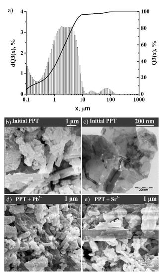 Particle size distribution of potassium polytitanates (PPT) before sorption (a); scanning electron microscope (SEM) (b) and transmission electron microscope (TEM) image (c) of PPT before sorption, and SEM image of PPT after sorption of Pb2+ (d) and Sr3+ (e).