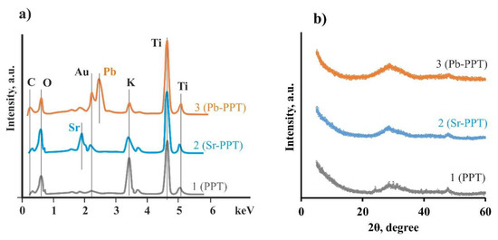 Chemical composition data (energy-dispersive X-ray spectroscopy (EDX)) (a) and X-ray (b) of synthesized PPT and exposed sorbents (Sr-PPT and Pb-PPT).