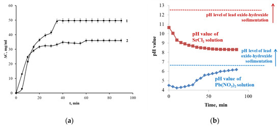 Figure 3 shows the time- and pH-dependent kinetics and limited sorption capacity of Pb2+ and Sr2+ ions. According to the kinetic curve of Pb2+sorption, the induction period accompanied the sorbent’s aging during the first 5 min of being on (Figure 3a, Pb2+-ion curve). This effect may have been caused by the slow destruction of inert lead complexes followed by its accumulation near the surface, which is typical of transition metal solutions [36,37]. Then, the lead sorption in the solution started to intensify, and in 30 min the system achieved a quasi-equilibrium state at ΔC = 42.0 ± 1.9 mg/mL. The second equilibrium occurred at 45 min, when the efficiency of Pb2+ ion extraction was 99.4% (the maximum decrease in concentration was 49.7 ± 1.5 mg/mL). The complex mechanism of PPT interaction with Pb2+ ions was caused by the layered structure of the sorbent—the first equilibrium at the initial stage could be most likely be explained by the ion adsorption on the PPT surface, whereas the second equilibrium was related to sorbate diffusion into the PPT interlayer space. Because the pH of the Pb2+-based PPT suspension during the sorption process was within the range of 4.5–6.2 (Figure 3b), sedimentation of oxide–hydroxide metal complexes was not expected, and Pb2+ ion intercalation processes were very possible.