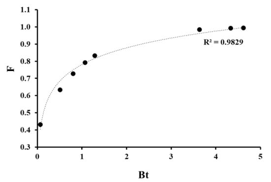 The sorption limitation by intra-diffusion processes was determined by the F − Bt dependence, where Bt is the dimensionless Boyd parameter calculated more accurately by Equation (3):