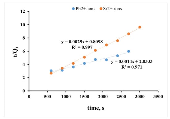 The ongoing sorption processes more likely corresponded to the pseudo-second-order of Ho and McKay’s model (Figure 7), regardless of the ion nature. The value of R2 for the log(Qe−Qt) dependencies was 0.903 and 0.884 for Pb2+ and Sr2+ ions, respectively (Figure 6), compared to 0.971 and 0.997 for the t/Qt dependence (Figure 7).