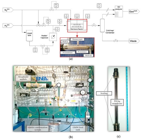 Experimental device for permeation/reaction tests: (a) general scheme and membrane cell details; (b) real assembly photography; and (c) finger-type Pd membrane.