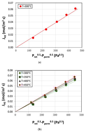Analyzing in detail the results for a constant temperature (T = 300 °C) but diverse pressure differences between permeate and retentate sides with an exponent coefficient of n = 0.5 (Figure 2a), it is clear that permeate flux increased linearly with the applied driving force. Thus, fitting to the Sieverts’ law with good accuracy (R2 = 0.99975) can be carried out, meaning that diffusion through the bulk PdAg layer is the limiting step of the permeation process and a reference permeance value of k = 1.325 × 10−4 mol·m−2·s−1·Pa−0.5 at these conditions was obtained. This general behavior was maintained for temperatures ranging from 300 to 450 °C (Figure 2b), with the permeate flux increasing as the temperature rose. Thus, permeances between 1.325 × 10−4 and 1.512 × 10−4 mol·m−2·s−1·Pa−0.5 were observed at these conditions, respectively. This fact is in good agreement with the typical Arrhenius-type dependence between permeance and temperature, obtaining an activation energy of 3.035 kJ·mol−1, within the range of other calculated values for similar membranes in previous works [,]. For an easier comparison, Table 1 summarizes the main results of permeation tests for this membrane together with other similar self-supported membranes produced by ENEA.
