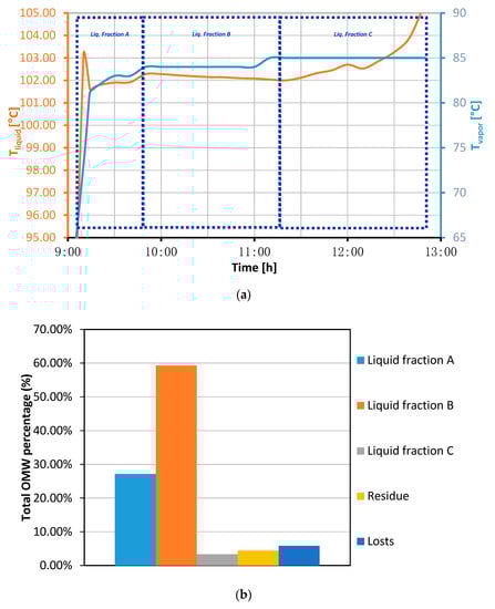 (a) Distillation curve of real olive mill wastewater (OMW) and (b) distilled mass fraction distribution.
