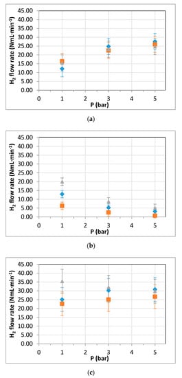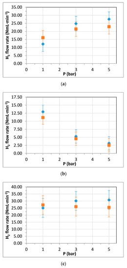 Figure 4 shows the amount of hydrogen produced after the reforming experiments at diverse conditions of inlet pressure. In all cases, the permeate side was purged with nitrogen in the counter-current mode at 1 bar, while the retentate pressure varied from 1 to 5 bar. Hydrogen in the permeate (Figure 4a) and retentate sides (Figure 4b), besides the total amount of hydrogen produced in the reformer (Figure 4c), are presented in the figure. For each experiment, 15 g/h of a mixture of OMW and synthetic bioethanol was fed into the equipment with the help of a carrier gas, nitrogen (blue diamond symbols) or air (orange square symbols). When using the former, nitrogen—an inert gas— the positive effect of increasing pressure on the lumen side was clear, obtaining an increase in the permeate flow rate (Figure 4a) and a consequent decrease in hydrogen in the retentate (Figure 4b). This fact implies an increase in the hydrogen recovery for the process. It is well known that an increase in pressure provokes a negative effect in the steam reforming thermodynamics of high molecular weight molecules present in both OMW and ethanol. This behavior was predicted by Rocha et al. [] in a previous modelling study and experimentally determined by Borgognoni et al. []. However, in the case of using a hydrogen-selective membrane, an increase in pressure improves the permeation rate, as previously shown in Figure 2, but produces a contrary effect on thermodynamics. In this particular study, for some operating conditions, the positive effect of pressure on the membrane’s performance seemed to prevail against the thermodynamics deterioration. According to the predictions of Sieverts’ law and the permeation tests described in the previous section, a pressure increase provokes a clear promotion of the permeation process. Thus, the equilibrium of dehydrogenation reactions is also shifted to the product’s side (shift effect of the membrane), obtaining an overall increase in the total hydrogen produced in the membrane reactor as the pressure rises (Figure 4c). In general, it can be considered that the main reactions involved in the process are: